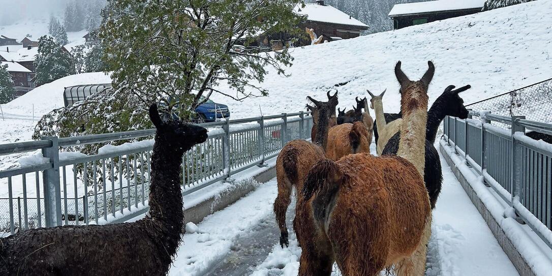 Die Lamas vom Lama- und Alpakahof mussten gestern in Steg durch den Schnee stampfen. Auch Kühe in Malbun wurden vom Schnee überrascht.