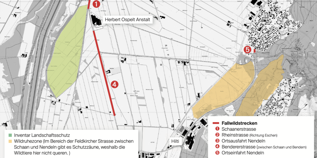Die Grafik zeigt die problematischen Stellen im Unterland auf – im Oberland quert das Wild zudem die Strasse zwischen Balzers und Triesen.