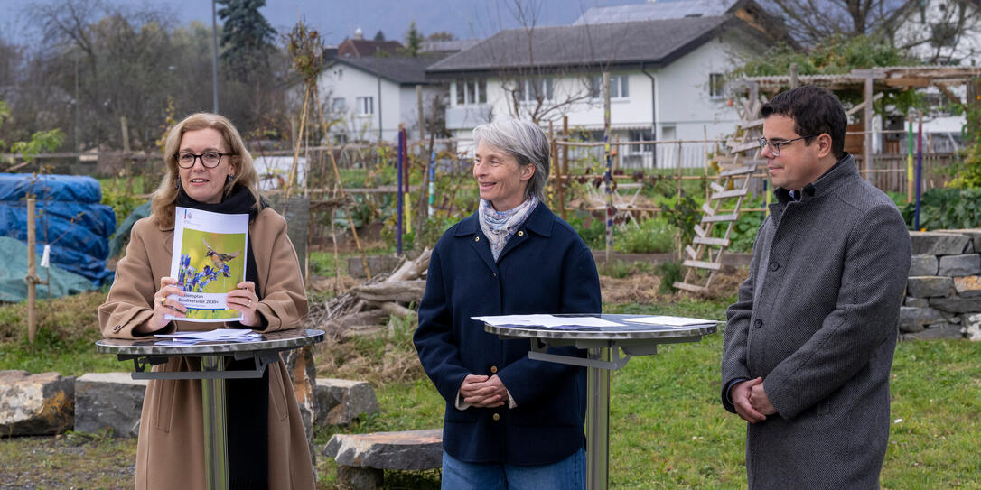 Regierungschef-Stellvertreterin Sabine Monauni, AU-Amtsleiterin Regula Imhof, und der Ruggeller Vorsteher Christian Öhri im Naturschaugarten der Gemeinde Ruggell.