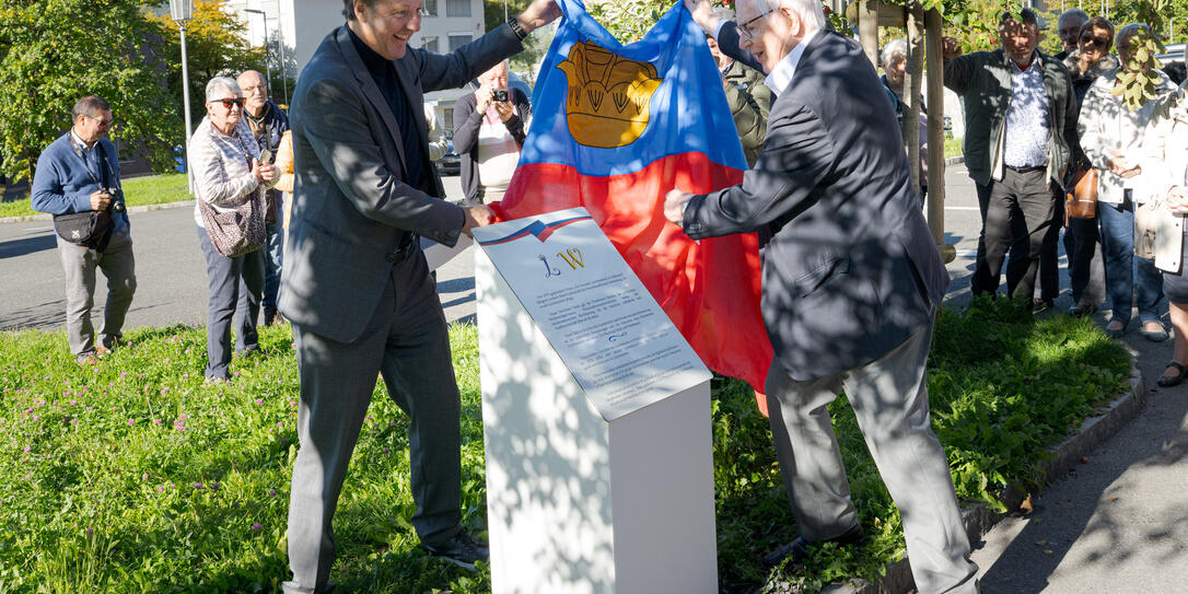 Honorarkonsul Alexander Ospelt (l.) und Joseph Guiot, Vizepräsident des Vereins «Die Freunde Liechtensteins in Wallonien», enthüllten