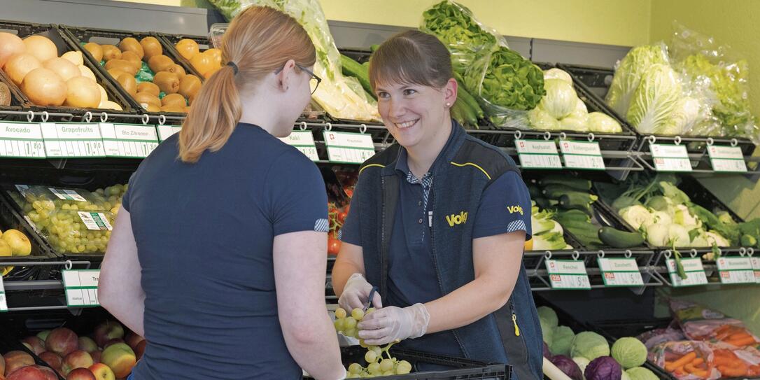 Martina Eggenberger räumt mit Deborah, einer ehemaligen Lernenden, Früchte ein.