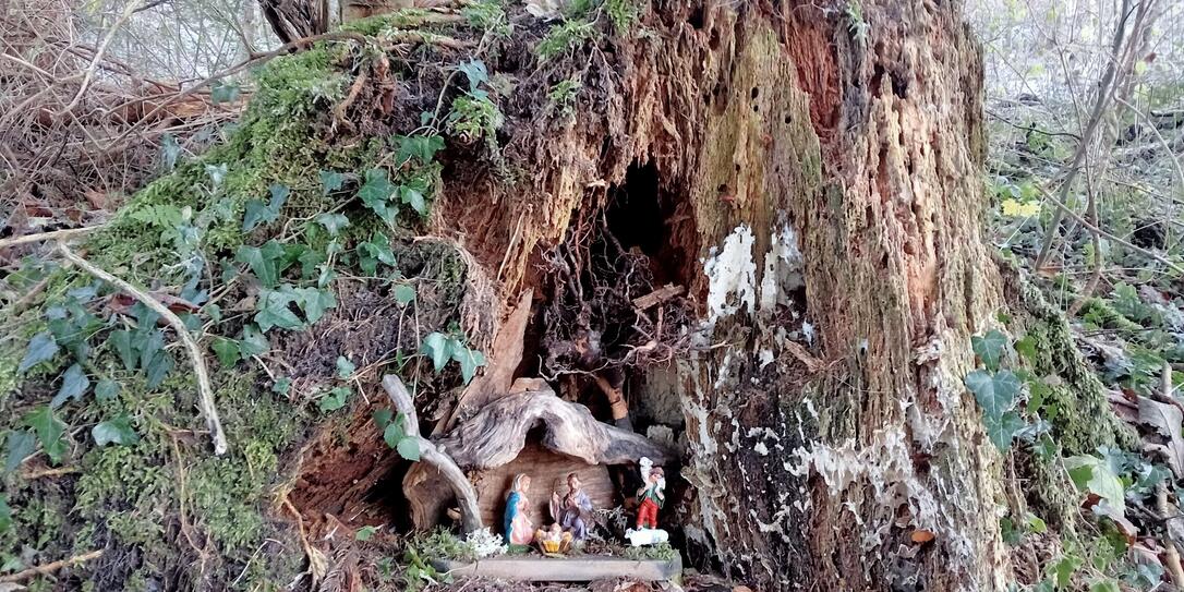 Manche der Krippen sind bei Baumstrümpfen untergebracht.