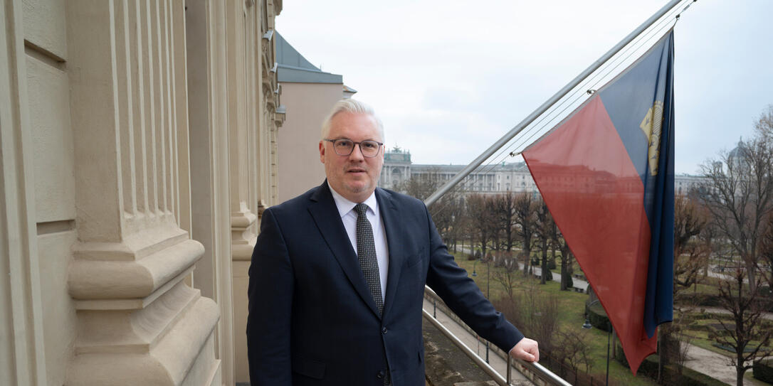 Botschafter Simon Biedermann auf dem Balkon der Liechtensteiner Botschaft mit Blick auf den