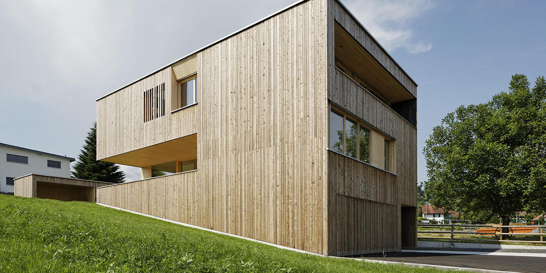 Konstruktiver Holzbau, der sich harmonisch in das bestehende Gelände einfügt.