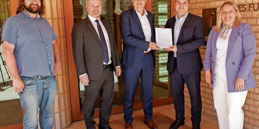 Bei der Übergabe der Petition: Jonas Grubenmann, Landtagssekretär Stefan Hassler, Dietmar Lampert, Landtagspräsident Manfred Kaufmann und Eva Maria Nicolussi Vogt (v. l.).