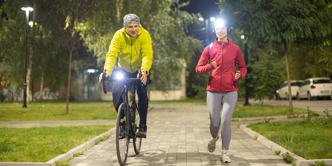Helle Kleidung mit Reflektoren und eingeschaltete Lichter erhöhen die Sicherheit – zu Fuss und auf dem Rad.