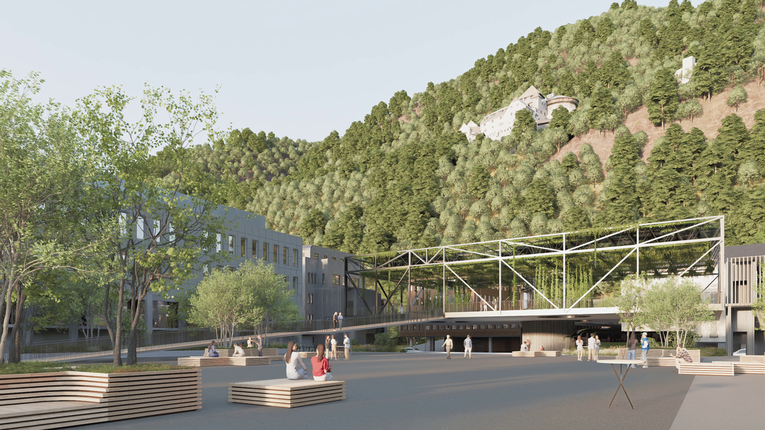 ‒ Beim vorgesehenen Kopfbau wird grosser Wert auf eine offene und durchlässige Gestaltung gelegt. Er ist nicht als geschlossener Baukörper oder Riegel konzipiert, sondern soll Sichtbeziehungen erhalten und den Raum zwischen Marktplatz und Umgebung bewusst offenhalten. Eine neue Rampe verbindet den Marktplatz mit dem Niveau der Äulestrasse, eine neue Fuss- und Radwegbrücke verbindet «Städtle» und «Äule» und ein Aufenthaltsplatz ermöglicht den Blickbezug auf das Schloss Vaduz. Die Konstruktion ist als filigraner Skelettbau mit teilweise gedeckten und beschatteten Aufenthaltsbereichen vorgesehen. Begrünungselemente sowie eine Photovoltaikanlage mit transparenten Modulen auf dem Dach sind geplant.