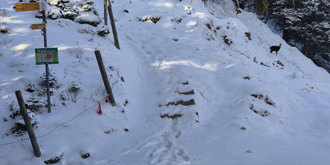 Trotz Infotafel und Betretungsverbot sind Fussspuren Richtung Wildruhezone zu sehen. Der Fotograf konnte auch eine Gams festhalten.