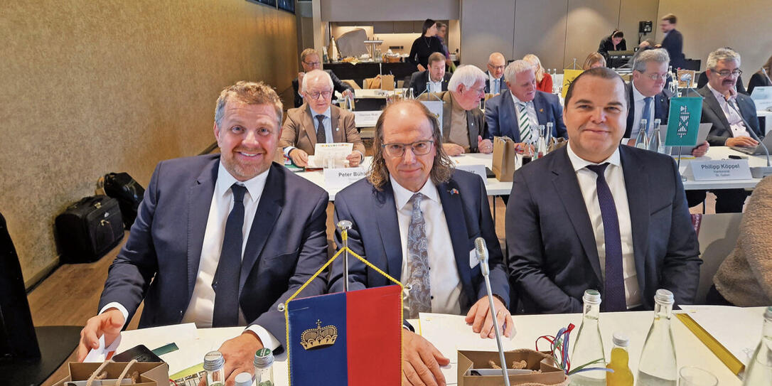 Die FL-Delegation während der Konferenz: Landtagsabgeordneter Simon Schächle, Stv. Abgeordneter Helmut Hasler und Landtagspräsident Manfred Kaufmann (v. l.).