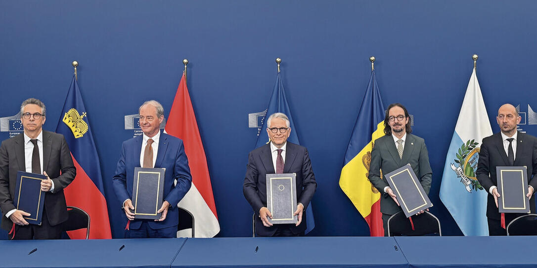 Pascal Schafhauser, Botschafter bei Liechtensteins Mission bei der Europäischen Union (ganz links), unterzeichnete am Montag das Änderungsprotokoll zum AIA-Abkommen Liechtenstein-EU.