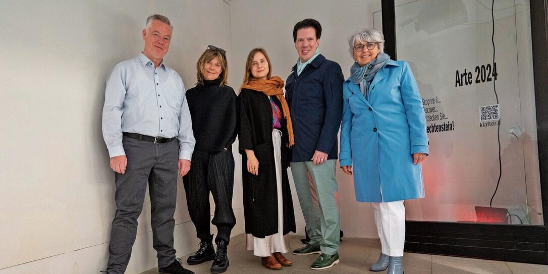 Elmar Gangl, Ursula Wolf, Karin Ospelt, Manuel Frick und Elisabeth Baume-Schneider (v. l.) besichtigen die Videoinstallation.