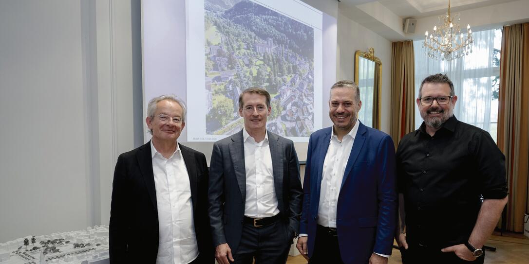 Präsentierten das Siegerprojekt: Fachjuror Christian Zimmermann, Ilias Läber für die Familie Schmidheiny, Gemeindepräsident Jens Jäger und Michael Ruffner von R+K Raumplanung (v. l.).