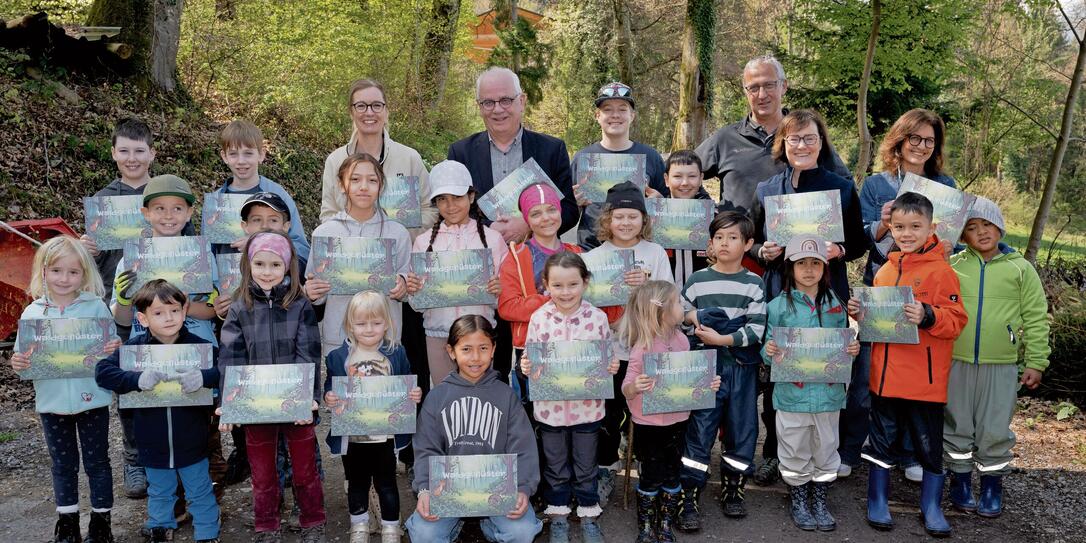 Das Interesse geweckt: Die Kinder entdecken gemeinsam mit den Verantwortlichen das neue Kinderbuch «Waldgeflüster».