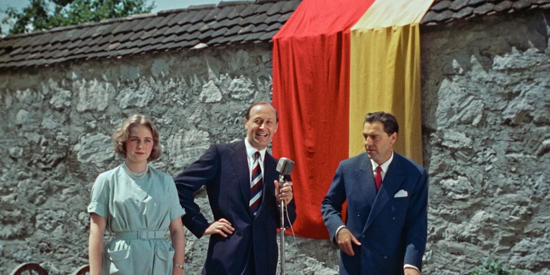 Baron von Falz-Fein (r.) zusammen mit Prinzessin Marie und Prinz Constantin bei den Dreharbeiten zu «Kinder der Berge» 1958.