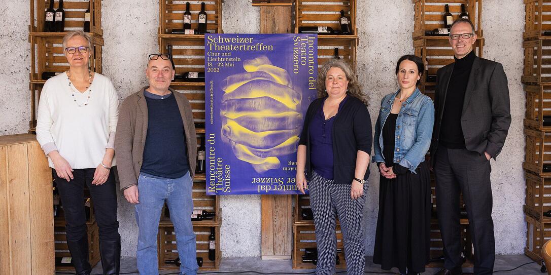 Präsentierten gemeinsam das Programm: Ute Haferburg, Präsidentin Schweizer Theatertreffen, Manfred Ferrari (Postremise Chur), Julie Paucker, künstlerische Leiterin, Martina Mutzner (Theater Chur) und TAK-Intendant Thomas Spieckermann.