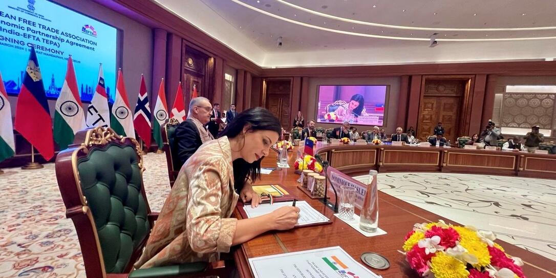Aussenministerin Dominique Hasler unterzeichnet für Liechtenstein das EFTA-Freihandelsabkommen mit Indien.