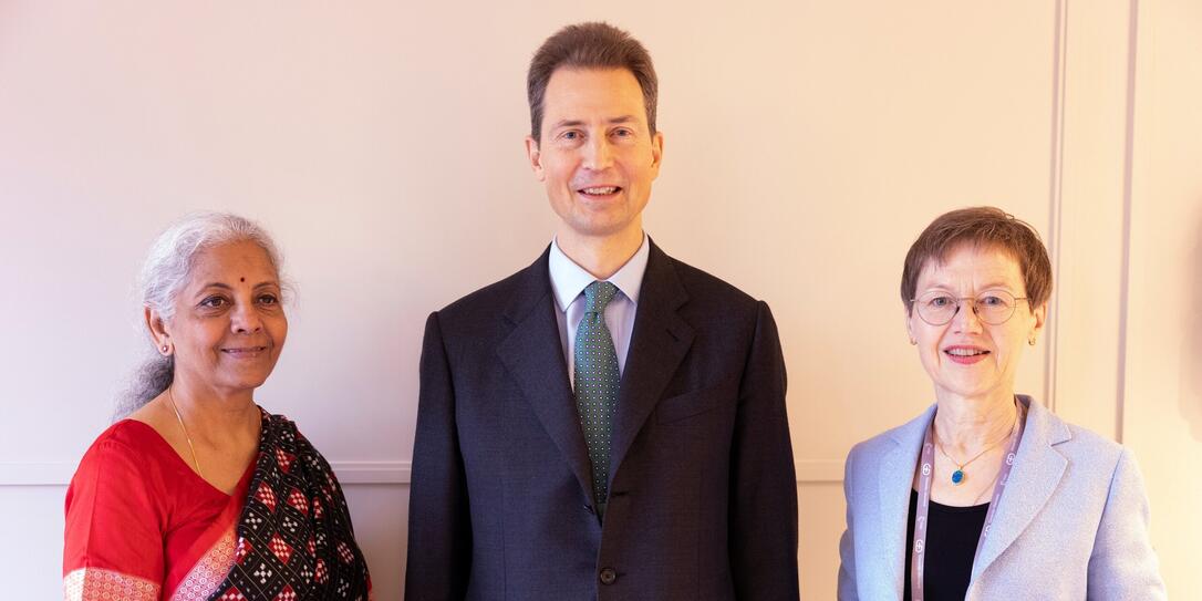 S.D. Erbprinz Alois von und zu Liechtenstein und Regierungschefin Brigitte Haas im bilateralen Austausch mit Nirmala Sitharaman, der Finanzministerin von Indien.