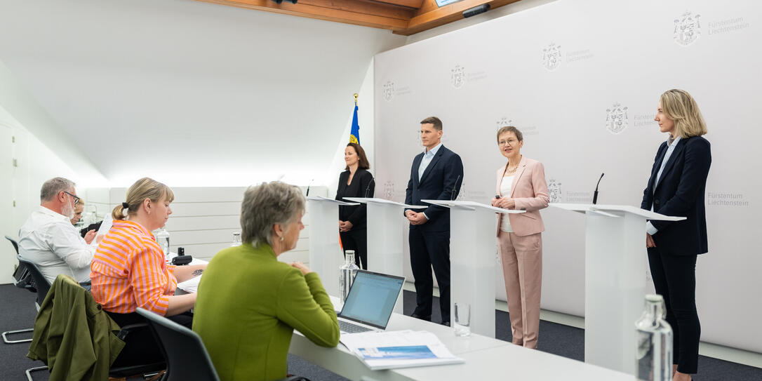 Juliane Marold (Amt für Personal und Organisation), Fabian Schmid (Amt für Informatik), Regierungschefin Brigitte Haas, Clara Guerra (Stabstelle für Digitale Innovation) stellten die Strategie vor. (von links)