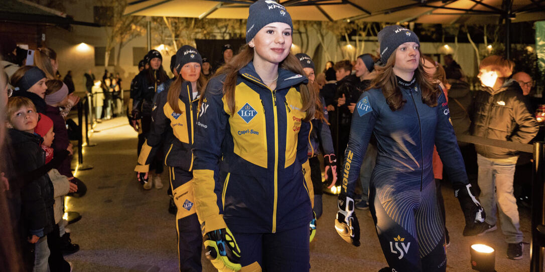 Die Athletinnen und Athleten des Liechtensteinischen Skiverbandes präsentieren ihre neue Bekleidung.