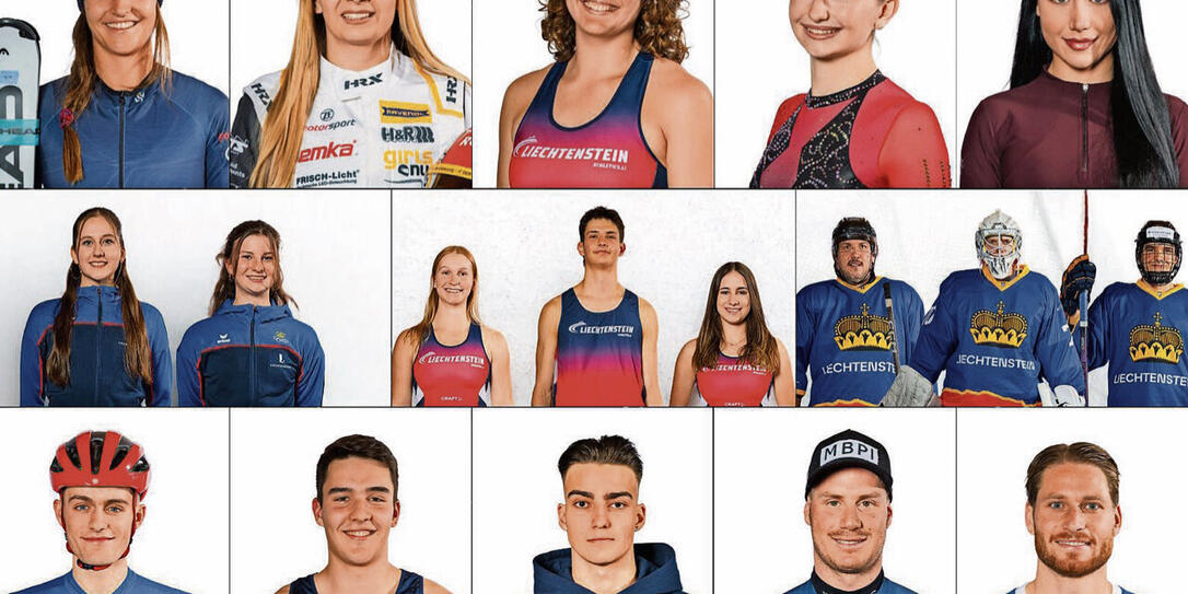 Die Kandidaten: Charlotte Lingg, Fabienne Wohlwend, Jule Insinna, Julia Weissenhofer und Léonie Guerra (oben v. l.); Team Artistic mit Aurora Notaro und Kira Beck, Team Leichtathletik mit Julia Rohrer, Joel Riesen und Fiona Matt, Team Eishockey mit Walter Fussi, Kevin Wanger und Julian Berard (Mitte v. l.) sowie Felix Sprenger, Matthias Verling, Rufus Bernhardt, Marco Pfiffner und Nicolas Hasler (unten v. l.).
