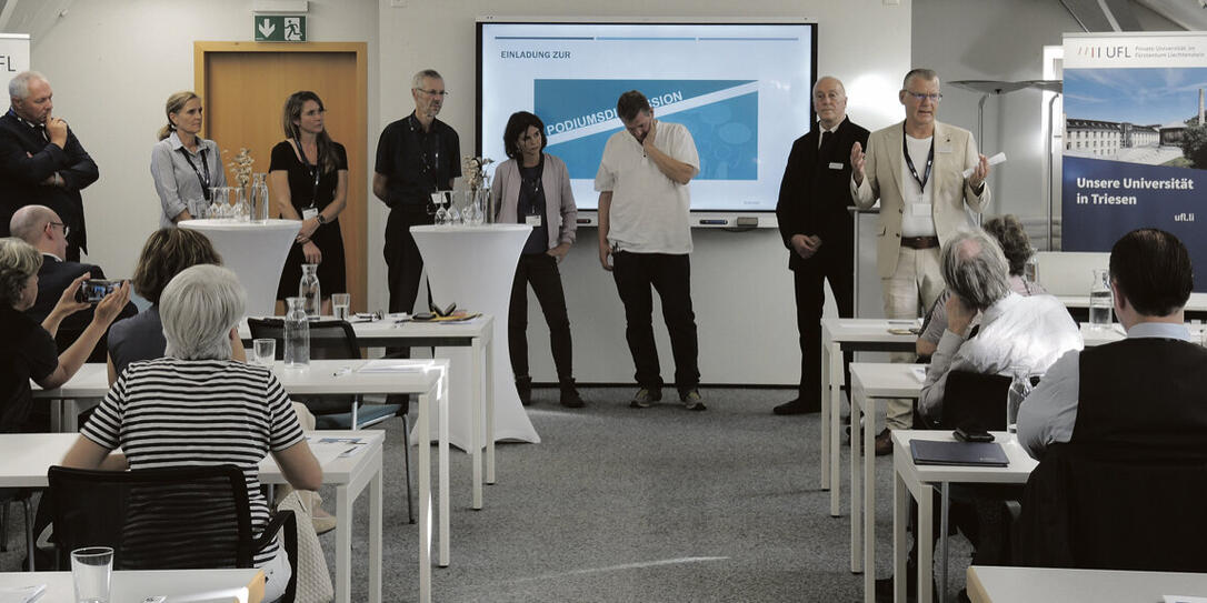 Podiumsdiskussion des UFL-Alumni-Kongresses: Walther Tabarelli, Dominique Tabarelli, Maya Stagge, Peter Janknecht, Daniela Sieber, Lorenz Risch, Sebastian Schildbach und Klaus Schliz (v. l.).