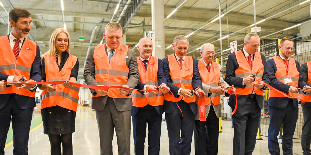 Die hochrangigen Gäste schneiden das Band durch: Juraj Blanár (Minister für auswärtige und europäische Angelegenheiten), Denisa Saková (stv. Premierministerin & Wirtschaftsministerin), Robert Fico (Premierminister der Slowakei), Hubert Büchel (Wirtschaftsminister Liechtenstein), Richard Senti (Verwaltungsratspräsident Hoval Group), Peter Herzog (Aktionär), Tomáš Horňák (Betriebsleiter Werk Istebné), Ján Babinský (Hoval Sales) und Fabian Frick (Co-CEO Hoval Group, v. l.).
