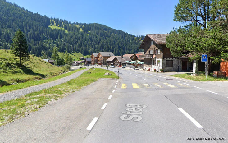An der Landstrasse Grosssteg im Bereich Steg werden Werkleitungen erweitert und erneuert. Während der Arbeiten wird der Verkehr einspurig durch die Baustelle geführt, Busse verkehren nach Fahrplan.