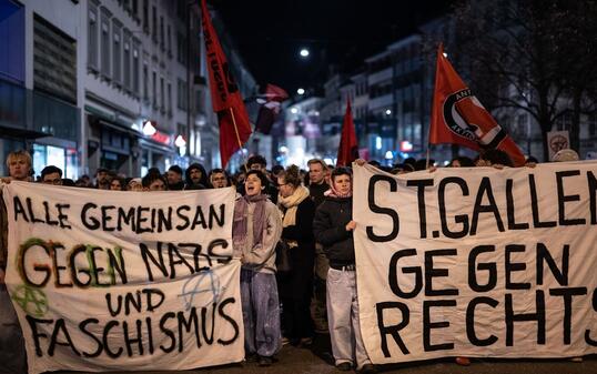 Nach einem unbewilligten Demozug von «Mass‑Voll» und der «Jungen Tat» demonstriert ein linkes Bündnis in St. Gallen gegen Rechtsextremismus – die erwartete Gegenseite blieb fern.