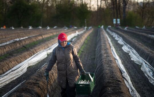 Bis zu 70 Tonnen Spargeln pro Saison: Türkische Frauen aus dem Vorarlberg ernten jeden Morgen das zarte Gemüse auf dem Schmitterhof in Diepoldsau. Seit Jahren sind es dieselben Familien, die die körperlich anstrengende Arbeit im Tieflohnsegment verrichten.