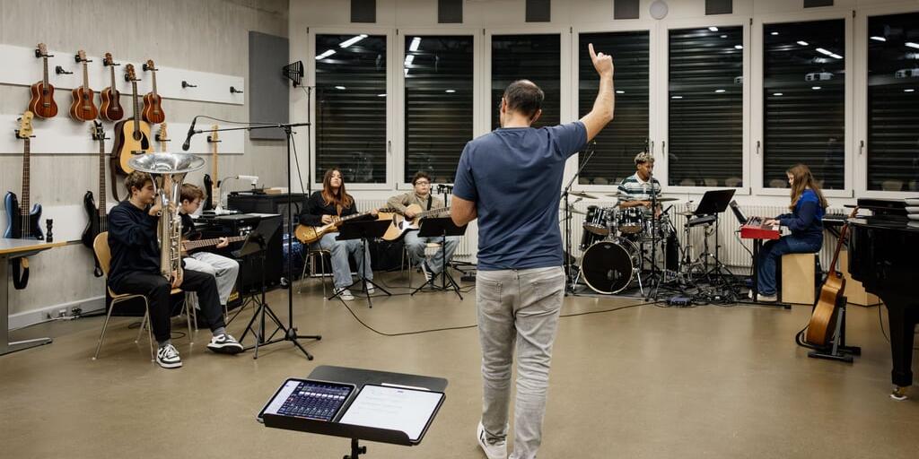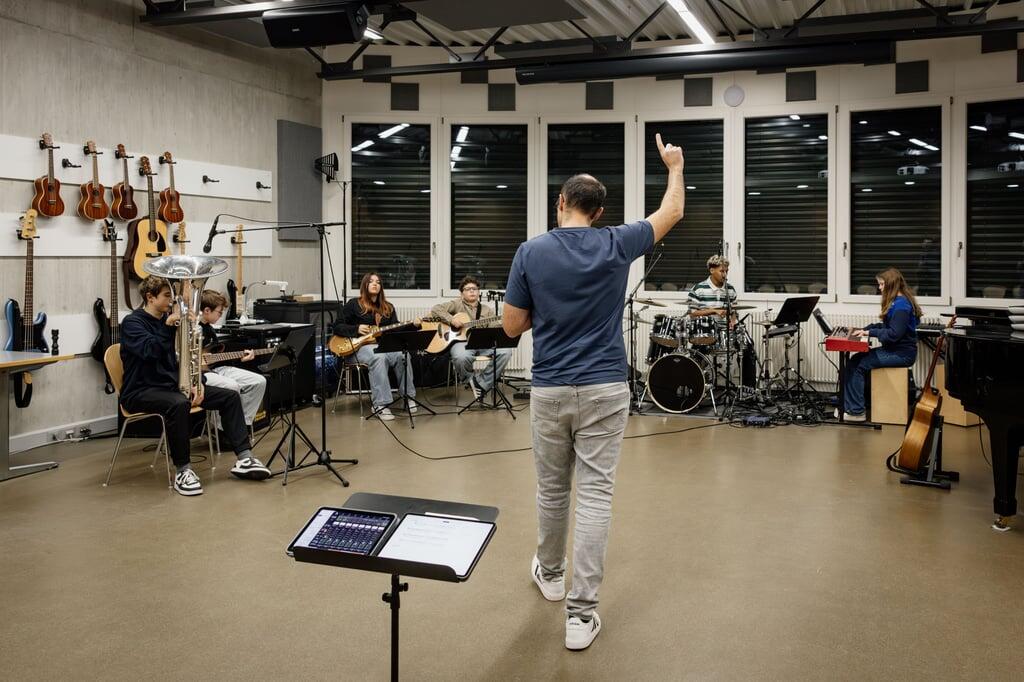 Das Schulhaus des Oberstufenzentrums in Arbon ist fast verlassen, nur vereinzelt brennt noch Licht im Schulgebäude. Beim Öffnen der Schultüre hört man leise Musik aus einem der oberen Stockwerke. Auf dem Weg durch den Eingangsbereich und die Treppe hinauf zur Aula wird die Musik immer lauter. «1,2,3,4», zählt Stefan Schindler, der Leiter der Bandprobe, hinter den Türen der Schulaula. Mit vollem Elan setzen die Schülerinnen und Schüler mit ihren Instrumenten auf sein Signal hin ein.