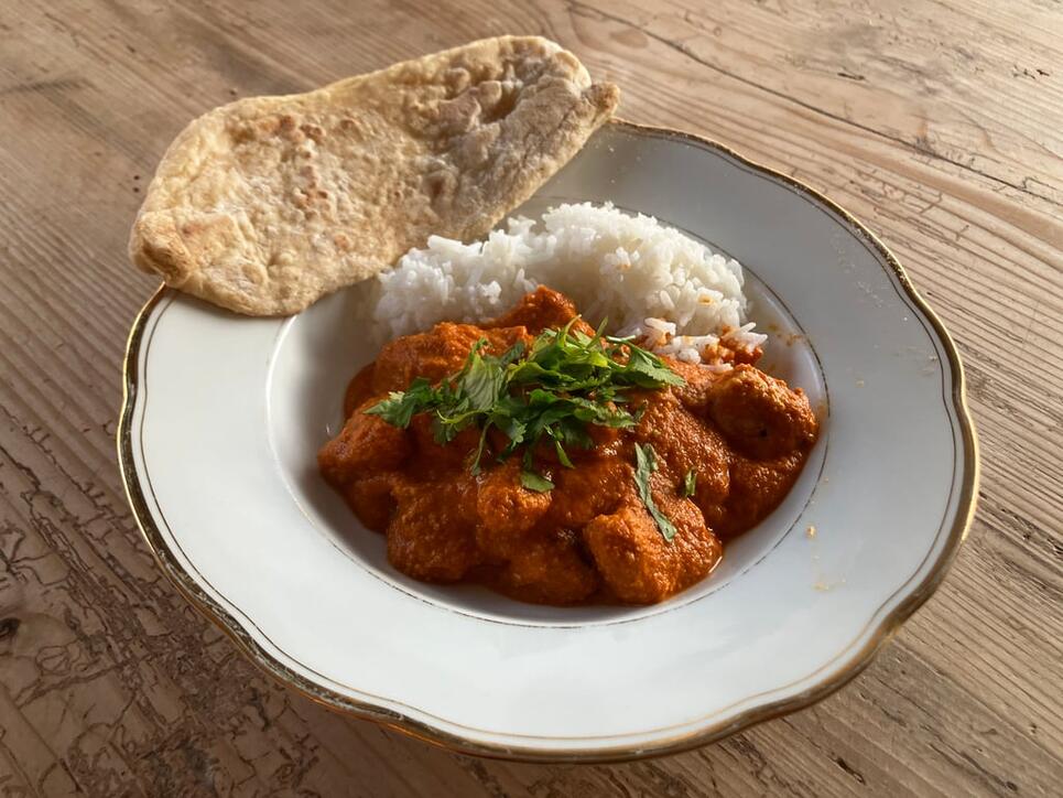 Alles noch ein paar Minuten köcheln – fertig ist das Butter Chicken für Heimwerker. Man braucht es nur noch zu dekorieren: Mit ein paar Tropfen Saucenrahm und etwas Koriander zum Beispiel. Oder gehackten Bockshornkleeblättern. Die sind nicht ganz einfach zu finden – ein Grund, weshalb sich der Besuch im Restaurant dann doch lohnt. Serviert wird das Butterhuhn am besten mit Reis und ein paar Naan-Broten. En Guete!