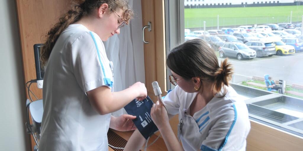 Ein Einblick in den Berufsalltag einer lernenden Fachfrau Gesundheit: Blutdruck messen.