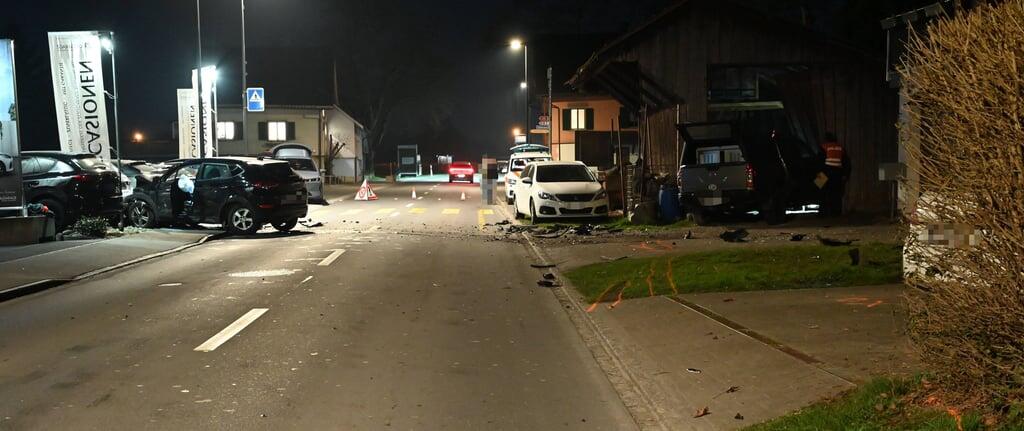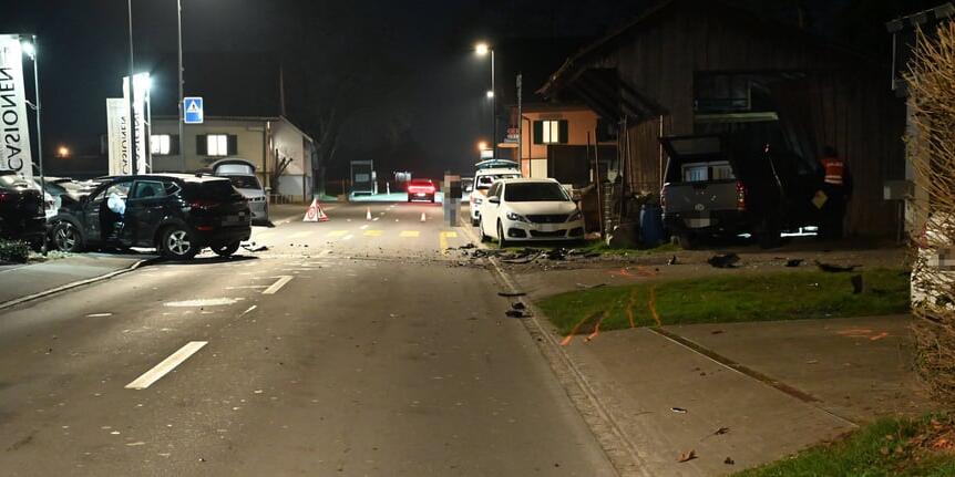 Wie es in der Mitteilung der Polizei heisst, wurde eines der parkierten Autos in eine Scheune gestossen, welche ebenfalls beschädigt wurde. Der Sachschaden beläuft sich auf rund 100'000 Franken. Der 50-Jährige wurde durch den Unfall unbestimmt verletzt und vom Rettungsdienst ins Spital gebracht. (kapo/chs)