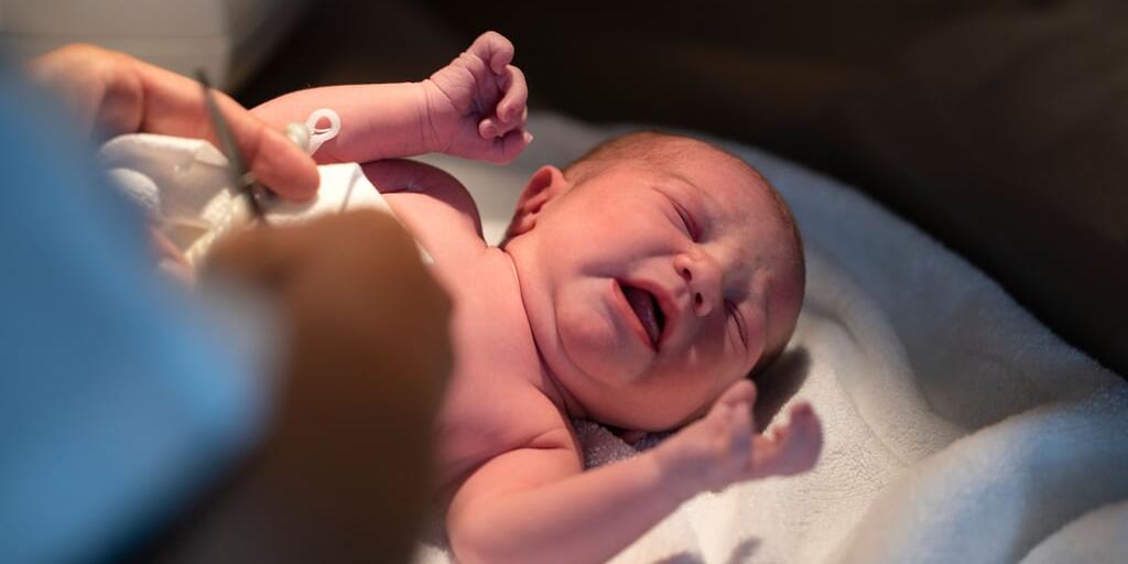 Eine Hebamme untersucht ein neugeborenes Baby.