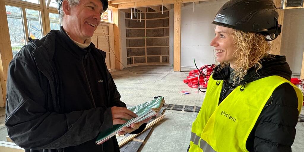 Daraus wird das Lehrerzimmer: Die beiden Bauleiter Christoph Deutsch und Tanja Ganic haben gut Lachen. Die Arbeiten verlaufen im Zeitplan.