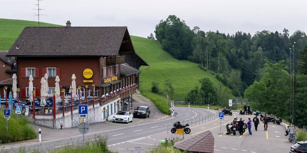 Motorradfahrer versammeln sich vor dem Gasthaus Hulftegg. Für Anwohner sind sie ein Ärgernis, doch die Polizei kann nicht viel tun.