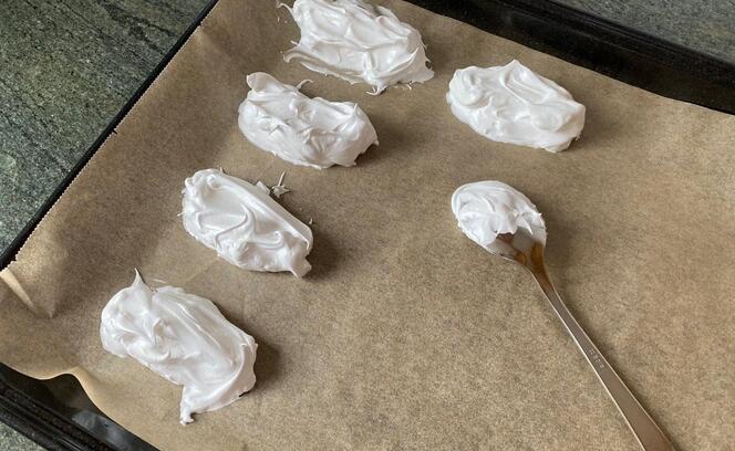 Aus dem Eischnee werden nun mittels eines Spritzsackes oder eines Löffels auf einem mit Backpapier belegten Blech die Meringues geformt. Ich bevorzuge den Löffel, weil so bizarre Formen entstehen, die nach «hausgemacht» aussehen. Es muss dabei zügig gearbeitet werden und das Blech sollte rasch in den Ofen, sonst löst sich der Zucker allmählich zu Sirup auf.