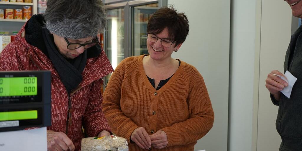Noch ist Melanie Knechtle (in der Mitte) vor Ort, um den Kundinnen und Kunden das neue System zu erklären. Doch bald bedient sie den Laden nur noch samstagvormittags.