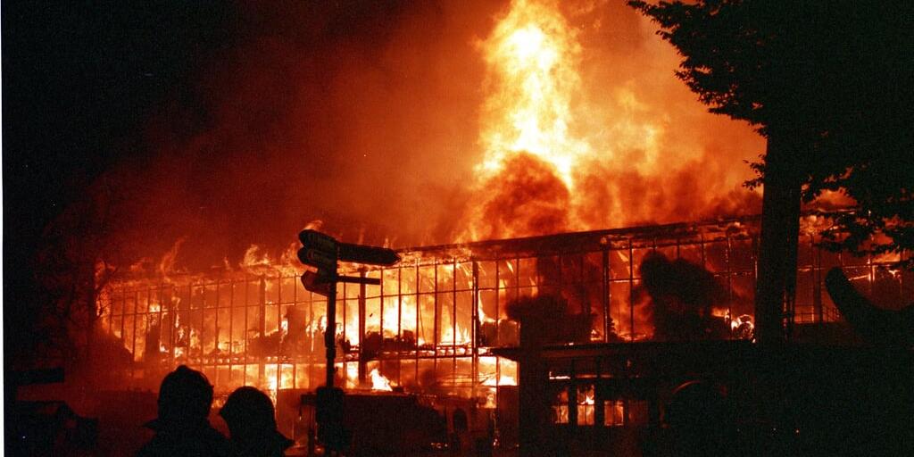 Am späten Abend des 22. Oktobers 2000 brennt die Olmahalle 7: Das Feuer breitete sich in rasender Geschwindigkeit auf die ganze Halle aus.