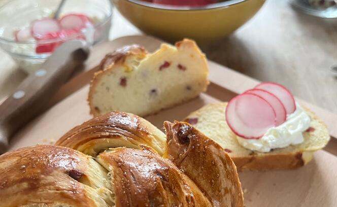 Etwas Frischkäse und frische Radiesli passen besonders gut zu diesem Zopf. Es muss aber nicht unbedingt herzhaft sein, auch süss passt, zum Beispiel etwas Feigen- oder Quittenkonfi: Und auch zum Ei passt der Speckzopf bestens. In diesem Sinne: Viel Spass beim Eiertütschen!