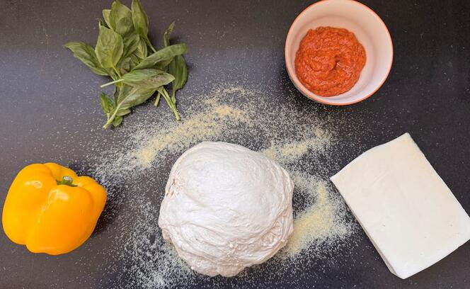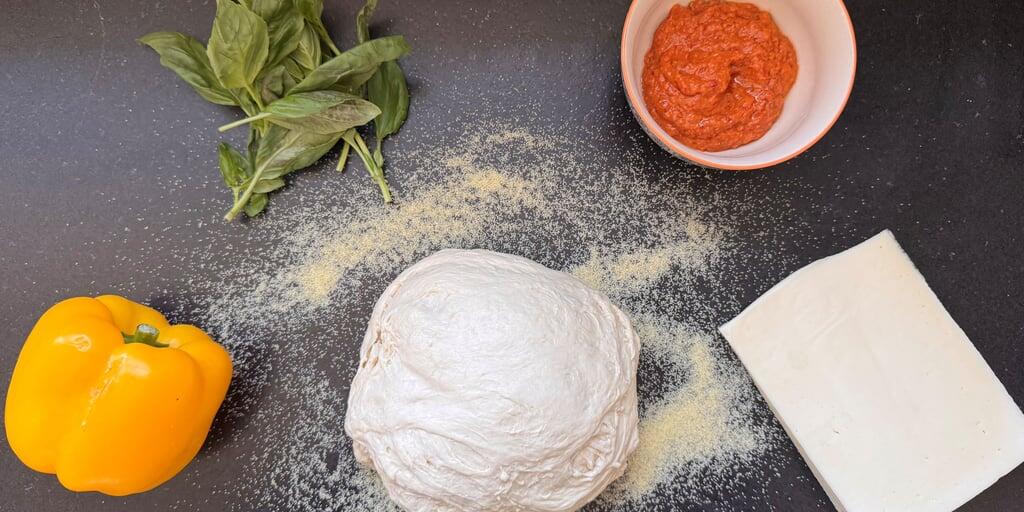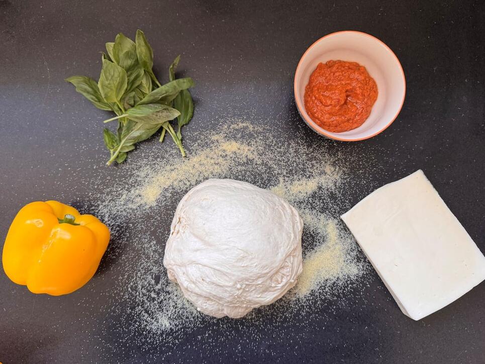 Zutaten: 600 g Pizzamehl, etwa 3,5 dl kaltes Wasser, 3 g Hefe, 10 g Salz, etwas Öl, etwa 100 g Hartweizendunst, 2 Peperoni, 100 g Asiago, ein Glas rotes Pesto, Basilikum