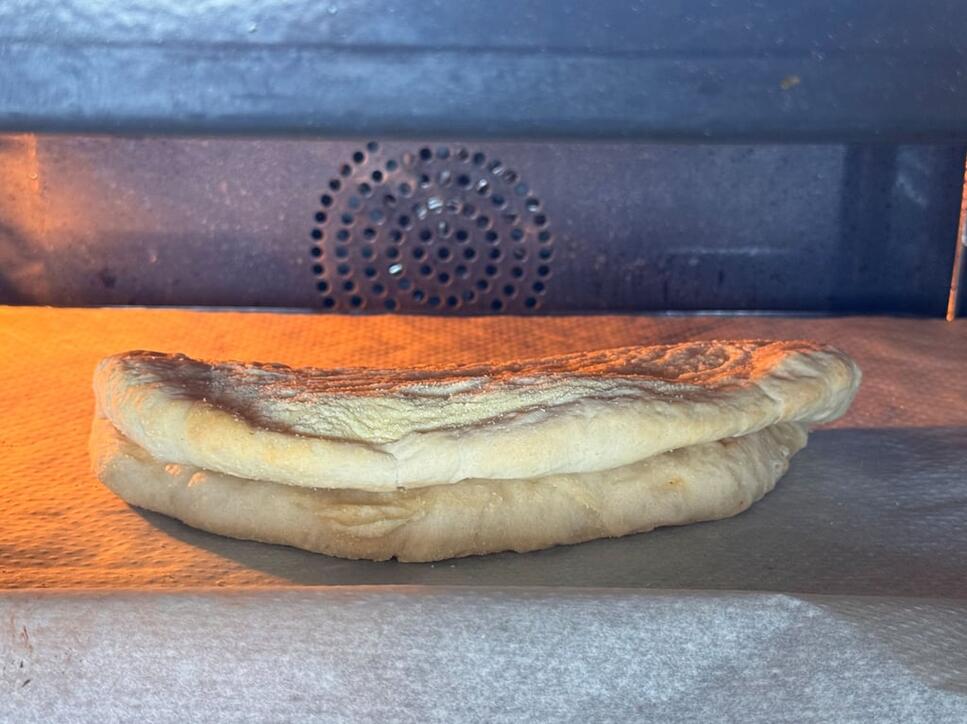 Den Teig mit den Fingern von innen nach aussen vergrössern und letztlich über den Handrücken dehnen, bis er einen Durchmesser von etwa 10 Zentimetern hat. Mit etwas Öl bestreichen und zusammenklappen. Für 6 bis 8 Minuten bei 230 Grad (Unterhitze mit Umluft) backen.