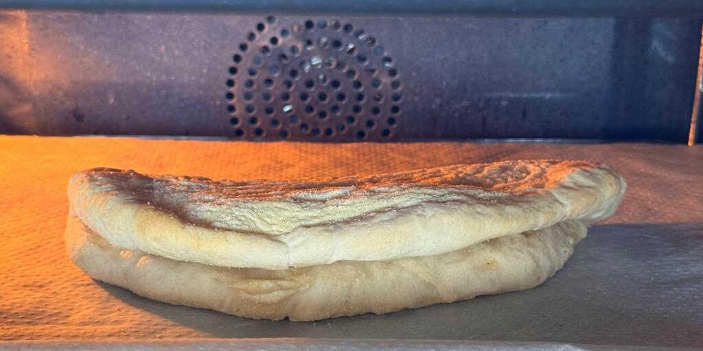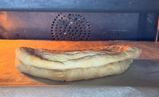 Ist der Teig gereift, geht es plötzlich ganz schnell. Den Teig wie eine kleine Pizza formen, mit etwa 10 Zentimeter Durchmesser, mit etwas Öl bestreichen und zusammenklappen. Das Panuozzo wird zweimal gebacken. Zuerst kommt es leer in den Ofen, dann mit Füllung und nur solange bis der Käse weich wird, aber noch nicht überall rausfliesst.
