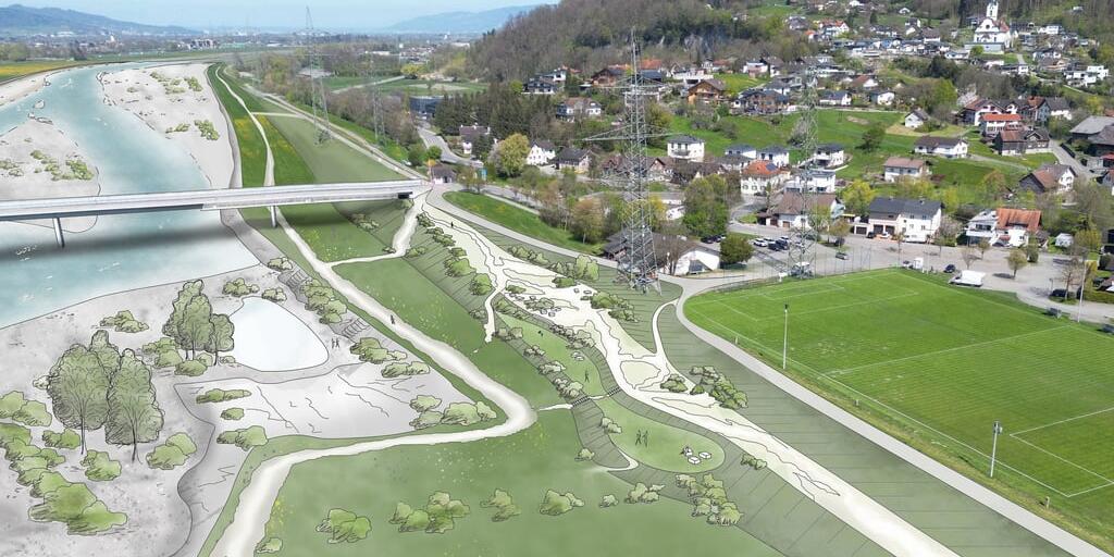 Umstrittene Rhesi-Planung: Die künftig breiteste Stelle des Alpenheins bei Koblach.