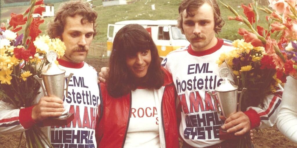Roland Bollhalder (rechts) mit seinem Bruder Emil Bollhalder holen 1978 den Tagessieg am Motocross in Rothenthurm SZ - mit Marocaine-Super-Ehrendame.