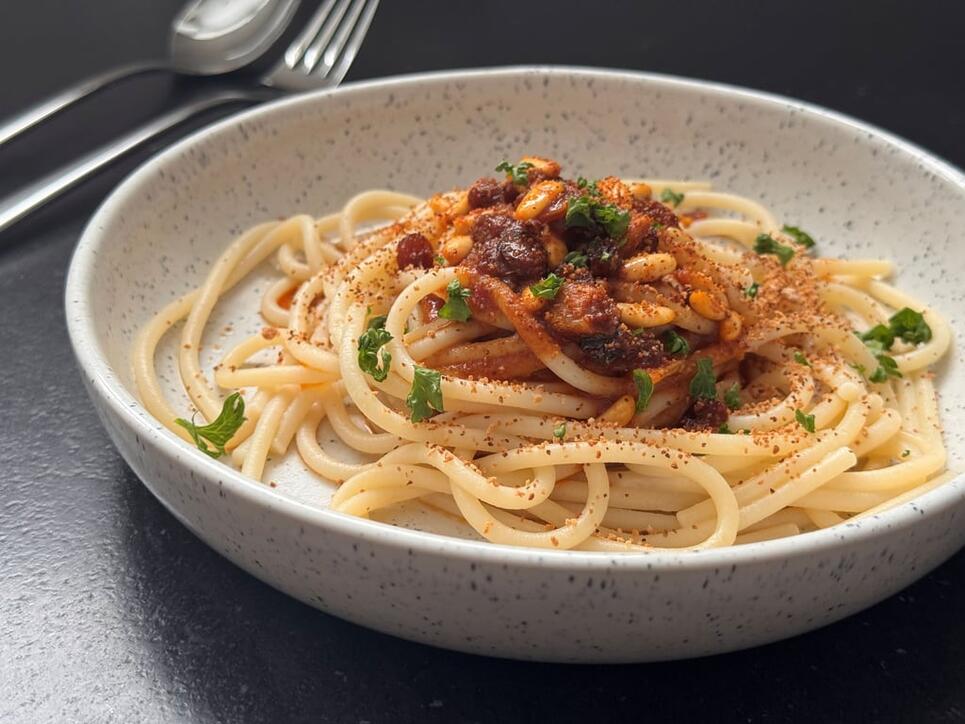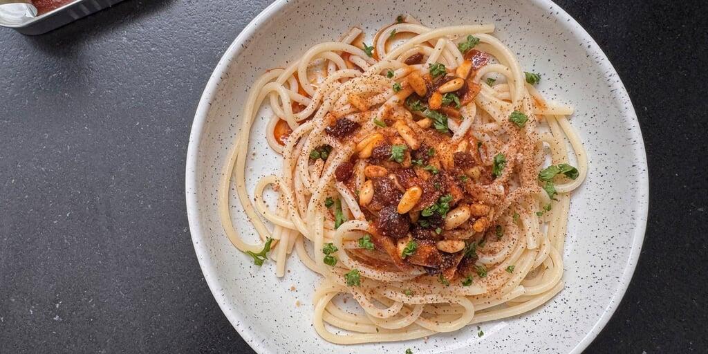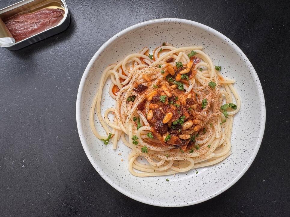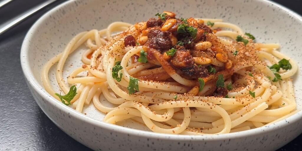 - Zubereitung: Spaghetti in einer Pfanne in heissem Wasser al dente kochen. In der Zwischenzeit Knoblauch in Scheiben schneiden und in etwas Olivenöl goldgelb braten. Rosinen halbieren. Pinienkerne, Sardellen, Rosinen und Tomatenpaste dazugeben und alles einige Minuten auf mittlerer Hitze köcheln, bis die Sardellen geschmolzen sind. Mit etwas Pastawasser verdünnen und die Sauce über die Spaghetti geben. In einer anderen Pfanne das Paniermehl rösten. Die Spaghetti damit bestreuen. Mit frischer Petersilie garnieren.