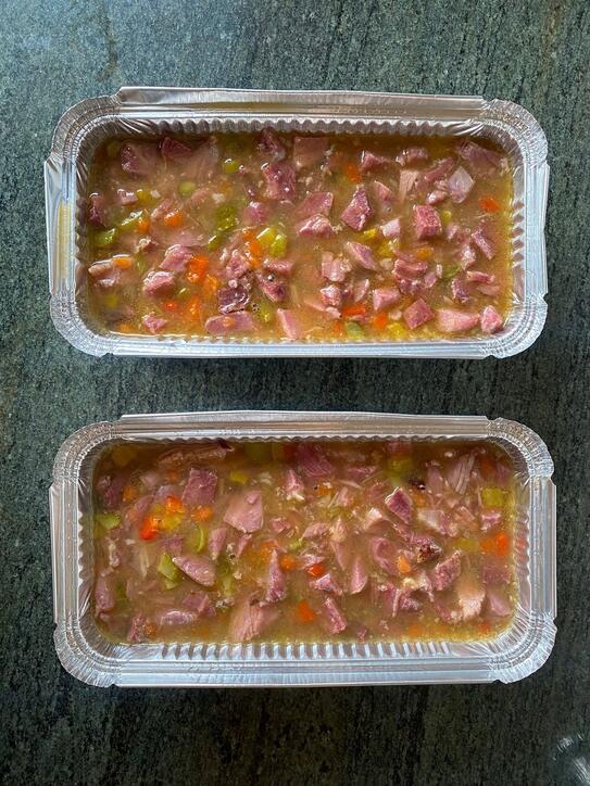 Die Peperoni- und Conichonwürfelchen über Wasserdampf nur so lange garen, dass sie noch knackig sind. Zusammen mit dem Fleisch und dem Gemüse in den Sud geben, kurz auf den Siedepunkt bringen. Den restlichen Cognac, Portwein du Sherry beigeben und wenn nötig mit Salz und Pfeffer abschmecken. Vom Feuer nehmen. Die Gelatineblätter kurz in kaltes Wasser einlegen, gut ausdrücken und in den Sud geben. Gut mischen. Alles leicht auskühlen lassen und dann in Aluschalen oder Pastetenformen füllen. Im Kühlschrank circa einen Tag durchkühlen lassen.
