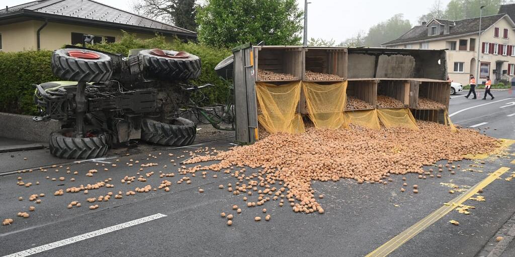 Der Traktorfahrer leitete sofort ein Ausweichmanöver ein. In der Folge kam seine Fahrzeugkombination ins Schleudern, woraufhin sie auf die rechte Seite kippte. Dadurch entleerten sich die auf dem Anhänger mitgeführten Kartoffeln auf die Strasse. Der 56-Jährige wurde durch den Unfall nicht verletzt. Es entstand Sachschaden von mehreren tausend Franken.