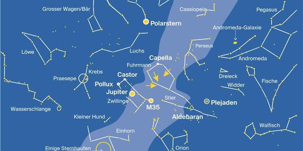 Jupiter: Er scheint im Sternbild Zwillinge und ist während der ganzen Nacht zu sehen.