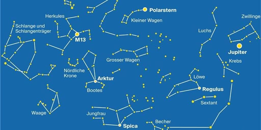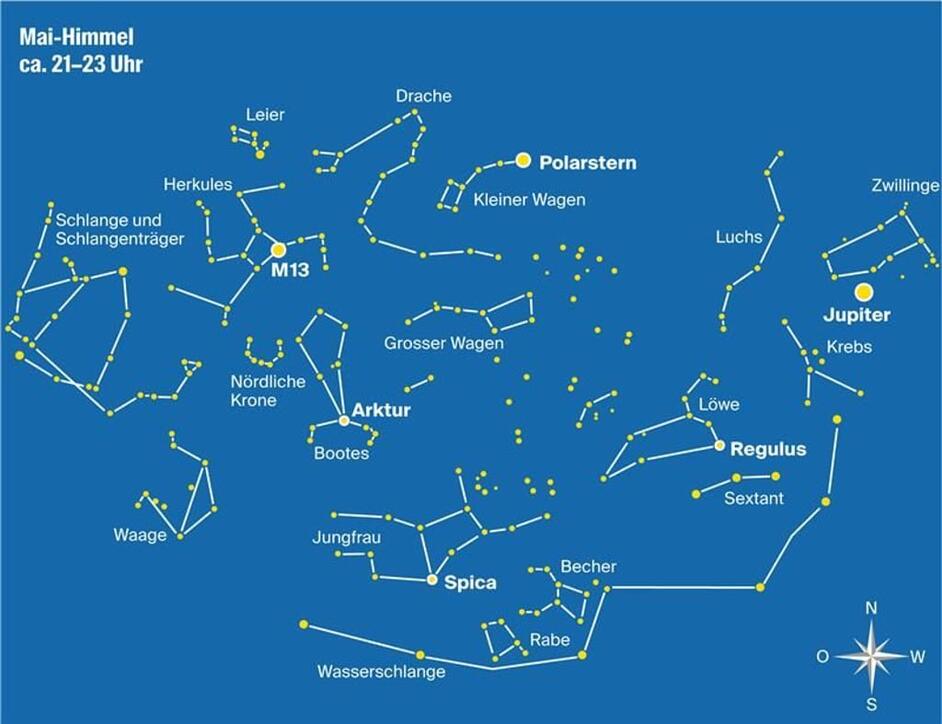 Wieder gibt es einen Monat mit zwei Vollmonden. Das ist selten der Fall. In unserer Region ist der Maihimmel fast ohne Milchstrasse. Sie verläuft von Ost über Nord nach West nur horizontnah und ist deshalb kaum sichtbar. In der Meridianregion fallen die Sternbilder Grosser Wagen oder Grosser Bär, Bootes mit dem hellen, rötlichen Stern Arktur und Jungfrau auf.
